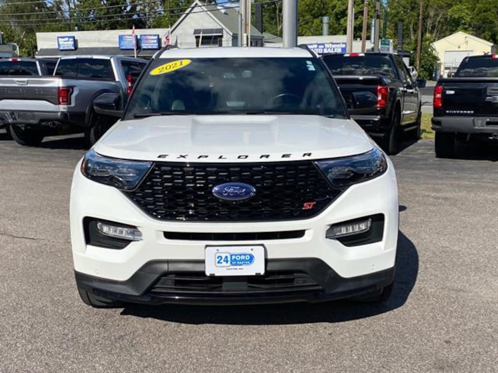 Fully Serviced!, Navigation System, Power Sunroof / Moonroof, Leather Seats, Remote Start, 4WD, 10.1" LCD Capacitive Portrait Touchscreen, 110V/150W AC Power Outlet, 2 Additional Speakers, 360-Degree Camera w/Split View, Active Park Assist 2.0, Auto-Dimming Rearview Mirror (Interior), Equipment Group 401A, Evasive Steering Assist, Ford Co-Pilot360 Assist+, FordPass Connect, Forward Sensing System, Front Rain-Sensing Wipers, Hands-Free Foot-Activated Liftgate, High-Performance Front & Rear Brakes, Intelligent Adaptive Cruise Control, Leather Htd/Ventilated Sport Captain's Chairs, Memory Driver's Seat, Performance Front & Rear Brakes, Power Tilt/Telescoping Steering Column, Premium Technology Package, Radio: B&O Sound System by Bang & Olufsen, Reverse Brake Assist, Second Row Heated Seats, Sideview Mirrors w/Gloss Black Caps, Speed Sign Recognition, ST High Package, ST High-Performance Pack, ST Street Pack, SYNC 3 Communications & Entertainment System, Third Row PowerFold (Folds Flat), Universal Garage Door Opener (UGDO), Voice-Activated Touchscreen Navigation System, Wheels: 21" Aluminum, Wireless Charging Pad. CARFAX One-Owner. Star White Metallic Tri-Coat 2021 Ford Explorer ST 4D Sport Utility 4WD 10-Speed Automatic 3.0L EcoBoost V6 24 Ford of Easton is Massachusetts's Premier Family-Owned New Ford and Used Car Dealer, serving the needs of customers from South Easton to Brockton, Bridgewater to Stoughton, all the Greater Boston area, and everywhere in-between for nearly 20 years. In addition to sales, we also offer a state-of-the-art service department with all Ford Master-Certified Technicians, a Quick Lane Tire and Auto center for quick in-and-out service, and of course an outstanding Parts department. 24 Ford of Easton is your one-stop-shop for all your automotive needs. So don't hesitate. Call us now and ask to speak with one of our fully certified and customer-friendly Sales Consultants. From there, you will be able to schedule a test drive, Brake job or Oil Change of any of our 11 locations. We have New and Pre-Owned vehicles on the lot! DEALER FINANCING REQUIRED FOR ONLINE PRICE!!!