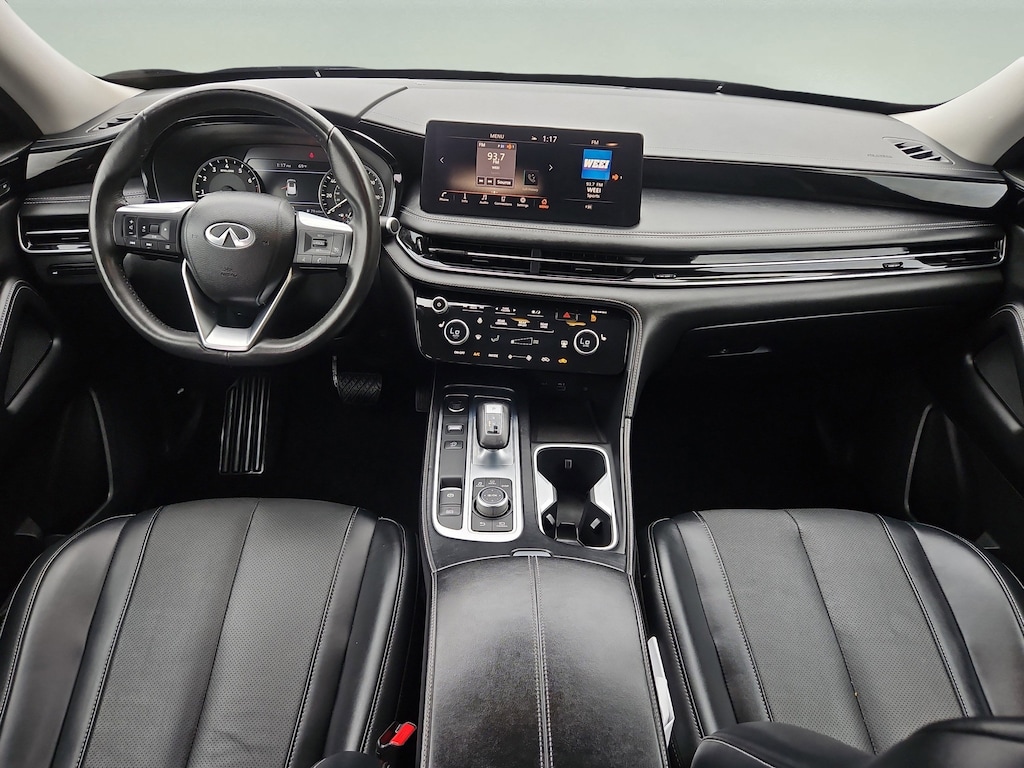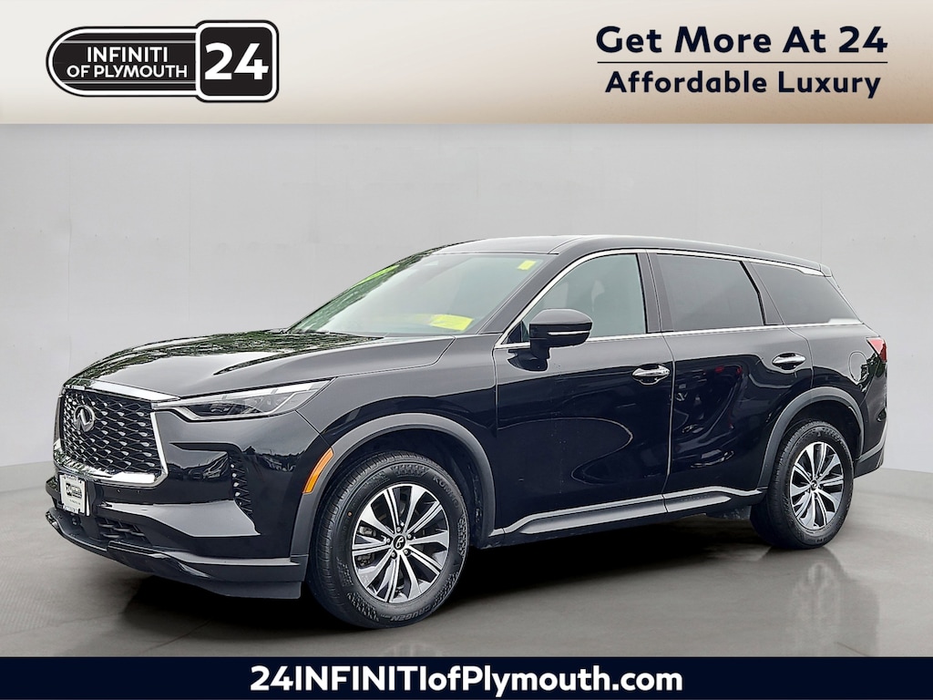 Experience refined luxury and advanced technology with this Black 2023 INFINITI QX60 AWD Pure. Powered by a robust 3.5L V6 engine paired with a 9-speed shiftable automatic transmission, this SUV offers smooth performance and all-weather confidence with its intelligent AWD system. Inside, enjoy the spacious cabin with leatherette upholstery, heated front seats, and a tilt/slide moonroof. Stay seamlessly connected using wireless Apple CarPlay and Android Auto integration via a stunning 12.3-inch infotainment screen. Safety comes standard with front, rear, and pedestrian automatic emergency braking, lane deviation sensors, blind spot monitoring, and rear cross-traffic alert. Additional features include a power liftgate, SiriusXM in-car apps, Bluetooth, multiple USB outlets for all three rows, and a hands-free power trunk. With aluminum alloy wheels, LED headlights, and a modern design, the QX60 is perfect for families or anyone seeking comfort, versatility, and peace of mind. Visit us today and elevate your drive with the luxury and reliability of INFINITI.Includes: Warranty available on all eligible INFINITI models up to five years / 60k miles (whichever occurs first) from the vehicle's original in-service date. [*]Warranty Includes: [*]$0 deductible167-point inspectionUp to six year / 75k mile (whichever occurs first) or six year / unlimited mile limited warrantyOne year of pre-paid maintenance (included within the first year of ownership)Up to five days of car rental reimbursement at a maximum of $50 per day